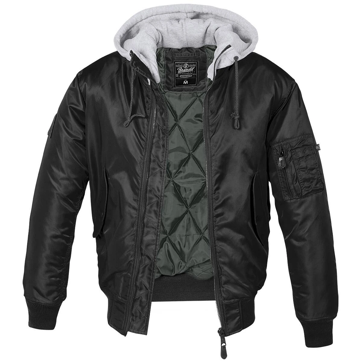 Die MA1 Sweat Hooded Jacke von Brandit wurde im Stil klassischer Bomberjacken gefertigt. Als besonderes Highlight besitzt sie eine Kapuze aus weichem Sweat-Stoff, die mittels Tunnelzug eng am Kopf getragen werden kann. Der Pilotenblouson besteht aus einem besonders strapazierfähigen und hochwertigen Nylonmaterial, welches wind- und wasserabweisend ist. Die Jacke besitzt zwei seitliche Schubtaschen mit Patten sowie eine Oberarmtasche mit Reißverschluss und Armbüro. An den Ärmeln und am Saum befinden sich Strickbündchen. Insgesamt besticht die Jacke durch Ihren hohen Tragekomfort und ihrer Strapazierfähigkeit.