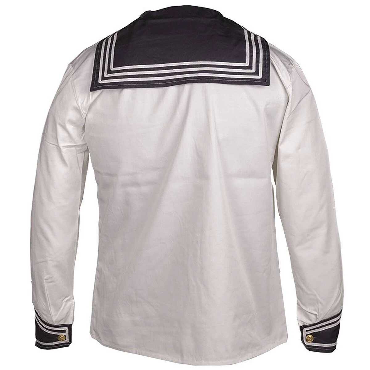 Das Marinehemd besitzt einen großen, blau abgesetzten Schulterkragen mit 3 weißen Streifen und blau abgesetzte Ärmelenden-Manschetten zum Knöpfen. Des Weiteren hat es goldfarbige Knöpfe mit Ankermotiv und eine eingebaute Brusttasche.
