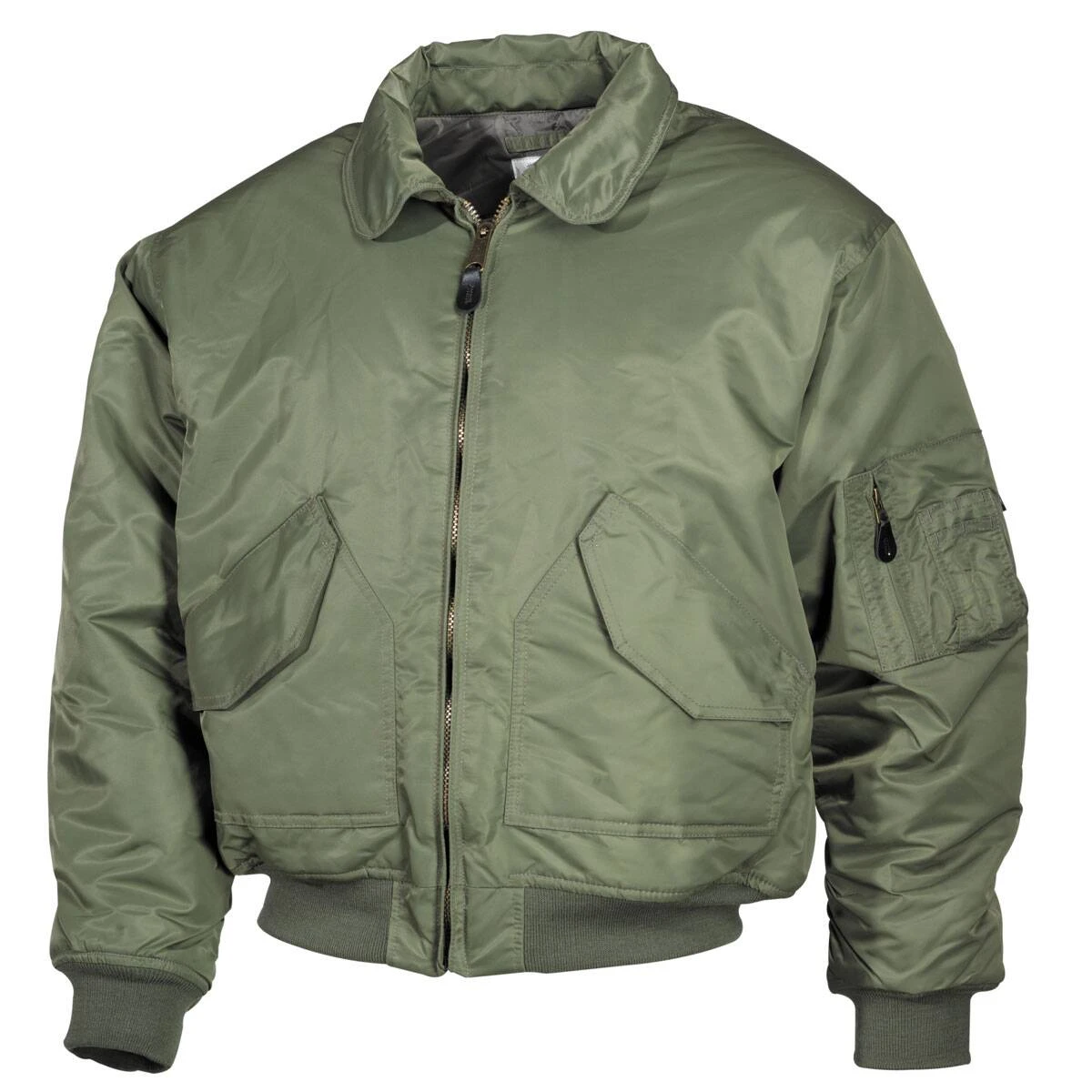 Diese top-modische und qualitativ hochwertig verarbeitete US Pilotenjacke CWU, die sehr gut dem Original der US Fliegerjacke CWU 45P nachempfunden ist, hat einen aufstellbaren und leger geschnittenen Kragen, einen starken Metall-Frontreißverschluss sowie 2 große aufgesetzte Pattentaschen. Außerdem besitzt sie ein Armbüro mit Stifthaltern und einer großen Reißverschlusstasche sowie lange, enganliegende Strickbunde an Ärmeln und Taille. Des Weiteren gibt es eine geräumige Innentasche. Die gesteppte Fütterung und die verstärkten Nähte stehen nicht nur für optimalen Kälte- und Nässeschutz, sondern auch für eine lange Lebensdauer.