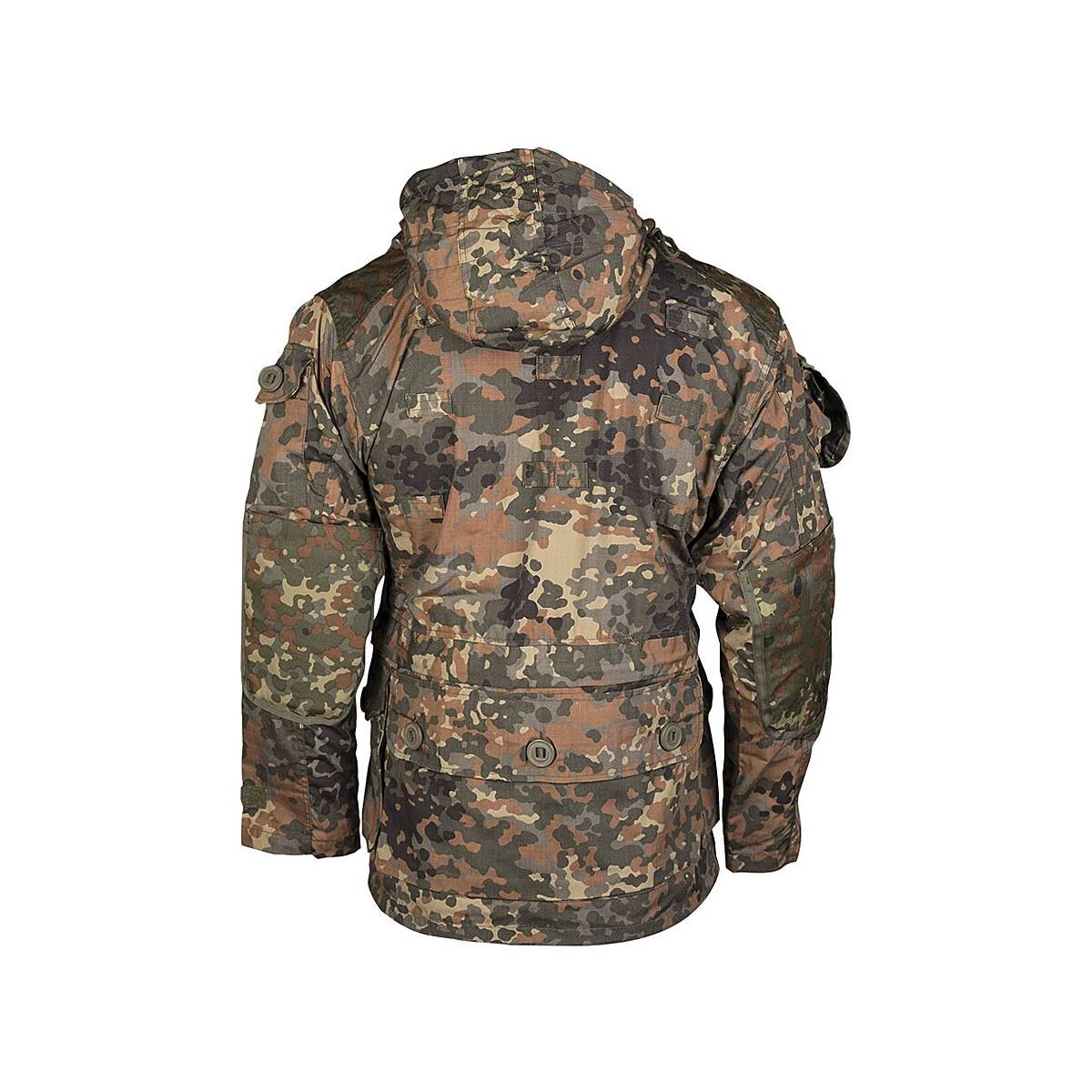 Die vielseitige Einsatzjacke von Mil-Tec besitzt einen robusten 2-Wege Front-Reißverschluss mit einer breiten, geknöpften Abdeckleiste sowie Klettabschluss oben und unten. 4 Taschen mit Patte vorne, 2 Brusttaschen mit Reißverschluss, eine Durchgreiftasche mit Reißverschluss, 2 Innentaschen mit Reißverschluss, die große Rückentasche mit Knöpfen sowie die aufgesetzte Oberarmtasche bieten unendlichen Stauraum. Im Achselbereich befindet sich ein Lüftungs-Reißverschluss. Außerdem gibt es Schlaufen auf dem Rücken und an den Schultern zum Anbringen von Tarnmaterialien und einen gepolsterten Ellbogenbesatz. Der Ärmelabschluss sowie die Hüft- und Bundregulierung erfolgt mittels Kordelstoppern. Zusätzlich gibt es eine große Kapuze mit Tunnelzug zum Verstellen und Drahteinsatz.