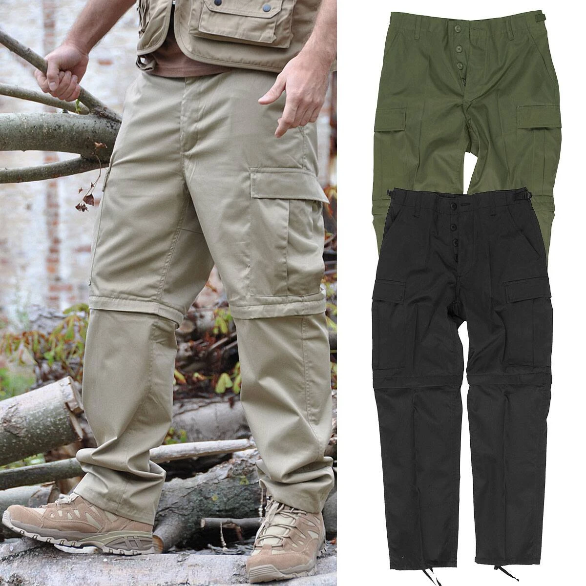 Diese Jungle Hose Zip-off ist wie die US Feldhose aufgebaut, nur dass die Beine mit einem Reißverschluss abnehmbar sind und die Hose damit auch als Bermuda tragbar ist. Sie besitzt 2 seitliche Einschubtaschen, 2 große seitlich aufgesetzte Beintaschen, 2 Gesäß-Pattentaschen mit verdeckter Knopfleiste, einen Bandanzug am Beinende, Gürtelschlaufen sowie eine verstellbare Taillenweite.